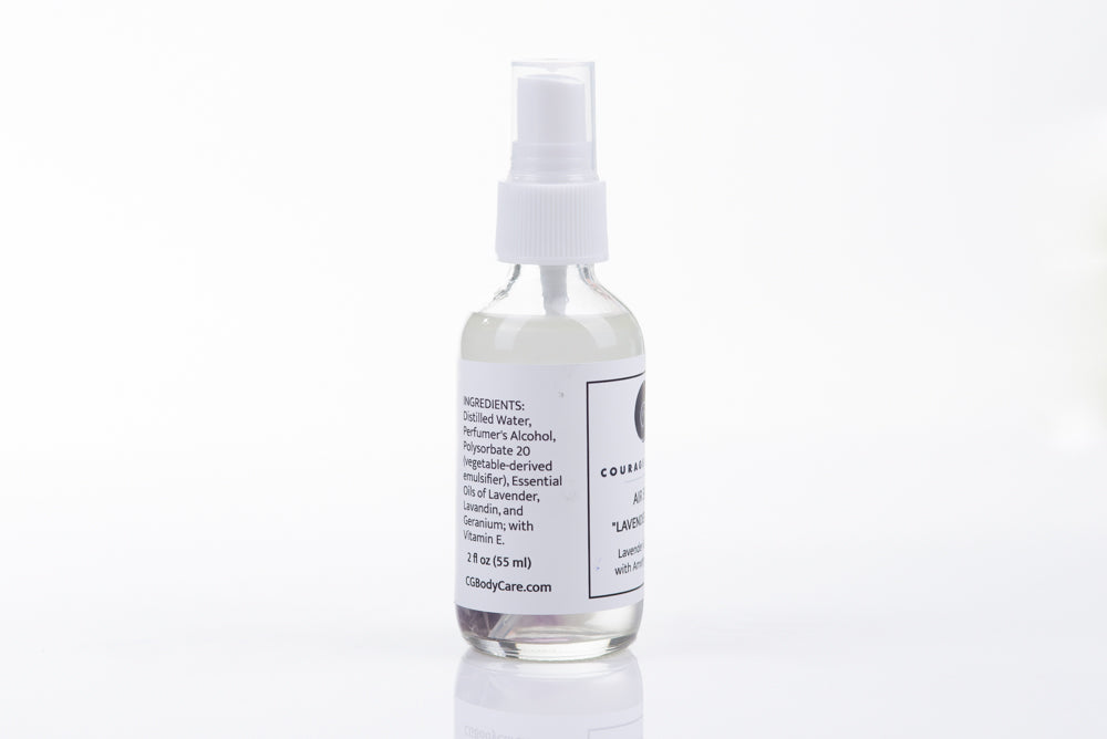 INGREDIENTS: Distilled Water, Perfumer's Alcohol, Caprylyl Capryl Glucoside (vegetable-derived solubilizer), Essential Oils of Lavender, Lavandin, Geranium, and Rosewood; with Vitamin E.
